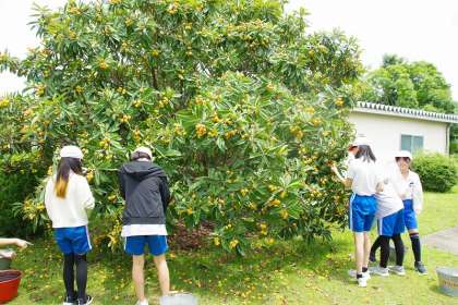 平和の森果樹園にて、6年生がビワと梅の実の収穫をしました。