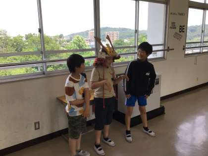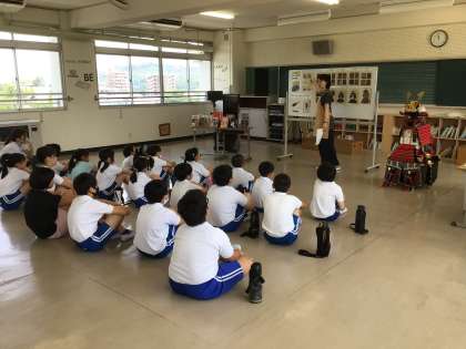 5年生の国語では、平家物語について司書さんの授業を受けました。授業ではレプリカの甲冑を観察しながら、倶利伽羅峠の戦いや一ノ谷の戦いなどにについて学びました。実際に甲冑を身につけることで、その重さを実感している児童の姿が見られました。