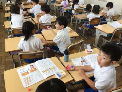 1年生の算数の授業では、「8はいくつといくつ」をめあてに学習を進めました。隣の児童同士でペアになり、8個のおはじきを両手に分けて持ち、それぞれの手に持っているおはじきの数を言い合うことで学びを深めていました。