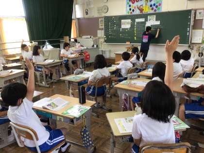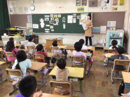 2年生の国語の授業では、司書さんから「ヤマタノオロチ」のお話しを聞きました。登場人物のイラストを黒板に貼りながら情景をつかみやすくすることで、児童は食い入るようにお話しを聞いていました。その後、「いなばのしろうさぎ」の紙芝居を見て、日本の神話への理解を深めていました。