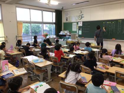 1年生の国語の授業では、「おおきなかぶ」を教材に学習を進めました。教師からの「みなさんの普段の生活の中で、うんとこしょ、どっこいしょ、と言う場面はありますか?」という問いかけに、「お母さんの手を引くとき!」など、1年生らしい発言が聞かれました。