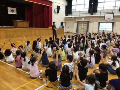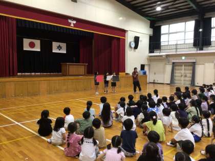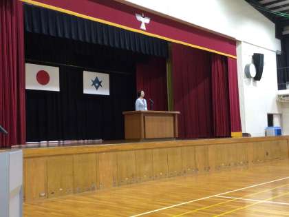 明日からの夏休みを前に全校集会を行いました。校長からは、今日を「これまでがんばった自分を褒める日」にして欲しいこと、夏休み中に困ったことがあれば、相談できる人に話を聞いてもらうこと、そして、心と体を元気にする夏休みにして欲しいという話がありました。