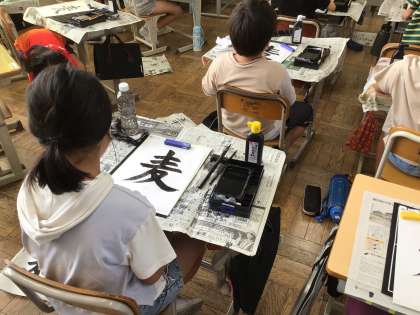 4年生の書写の授業では、「はらい」にポイントをおいて授業を進めました。「麦」の字の2つの左はらいの終筆が左右にならぶとき、間が徐々にせまくなるように意識しながら筆を運ぶ姿が見られました。