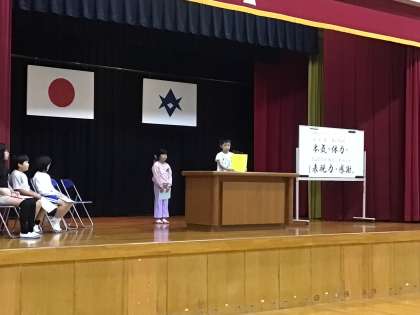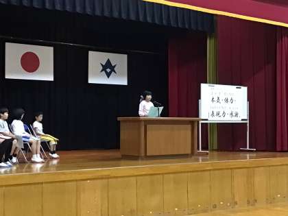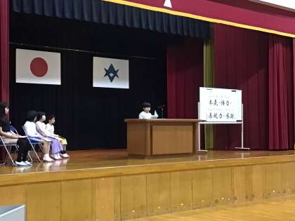 4年生の代表児童2人からは、前期に頑張ったこととして、整理整頓やあいさつ、トイレのスリッパをそろえることなど、下級生のお手本となれる生活規律のことや、周りへの気配りや心配り、そして「ありがとう」を大切にしながらクラスの輪を広げられるように意識して生活したことなどの話がありました。
