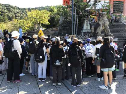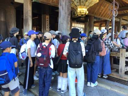 いよいよ修学旅行がスタートしました。雲一つない最高の天気です。交通渋滞もなく、スムーズに来ることができたので、清水寺は混雑する前に見学することができました。お弁当を食べ、これから班別学習に出かけます。