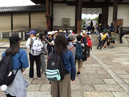法隆寺では、災害を避けることができるという「たい石」を踏んで見学を始めました。五重の塔や聖徳太子ゆかりの品々を見て、全員で最後まで活動を終えることができました。「まだ帰りたくない」という声も聞かれますが、一路学校へ向かいます。