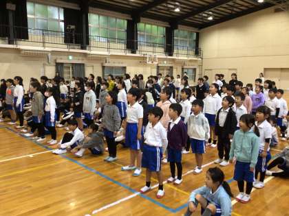 本日の朝、全校集会を行いました。集会では、6年生の代表委員から運動会のスローガン「全員全力!感動・感謝!みんなで築く運動会!」の発表とスローガンに込められた思いについて話がありました。