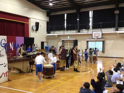 本日、芸術鑑賞会を行い、名古屋を拠点に活動する「GONNA(ガナ)」さんによる「和太鼓×マリンバ」の演奏を鑑賞しました。体育館に和太鼓の音が響き渡ると、その迫力に児童は釘付けになっていました。