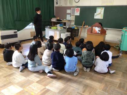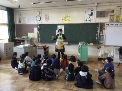2年生の国語の授業では、司書さんから昔話について学びました。「むかしむかし」や「めでたしめでたし」など、おなじみのフレーズが各地の方言ではどのような表現になるかを聞いて、感嘆の声を上げる児童のようすが見られました。また、「お饅頭のすきなお殿様」の紙芝居や「おむすびころりん」のエプロンシアターに熱心に聞き入る児童の姿が見られました。