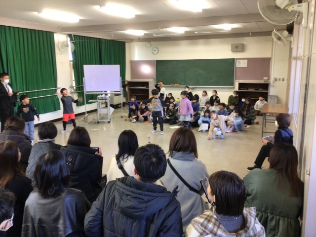 1年生の発表では、これまで一生懸命練習してきたコマ回しなど、昔遊びを披露しました。