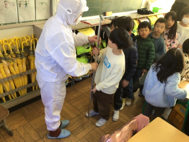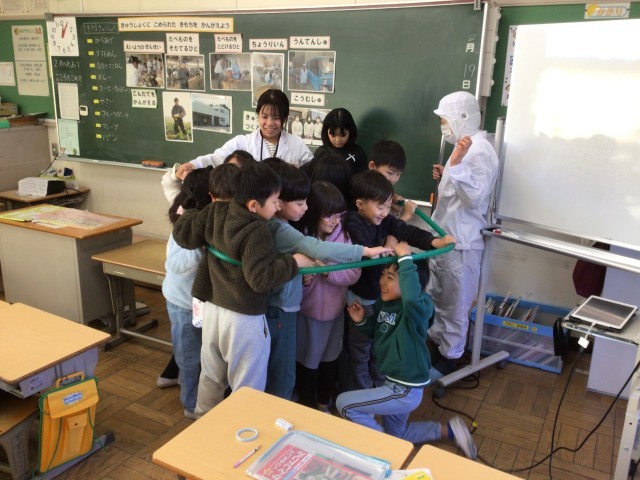 本日1年生は、栄養教諭による食育の授業を受けました。授業には平和給食センターの調理員さんに来ていただきました。「調理が大変な献立は何か?」という質問に対して、「かき揚げ」と「焼きそば」という回答に児童は驚いていました。「かき揚げ」は、材料のカットなどの準備がすべて手作業で大変であること、「焼きそば」は、釜の中で材料を混ぜる際に皆で息を合わせる必要があることなどを理由として話されました。また、「うれしいことは何か?」との質問に、「みんなが美味しいと言って給食を食べてくれることがうれしい」と答えられていました。その後、釜の直径と同じ大きさのロープの中に入り、釜の大きさを実感したり、材料を混ぜる際に使う「スパテラ」を実際に持って大きさを実感したりしました。給食への興味・関心と作ってくれる人への感謝の気持ちを高めることができた貴重な授業となりました。