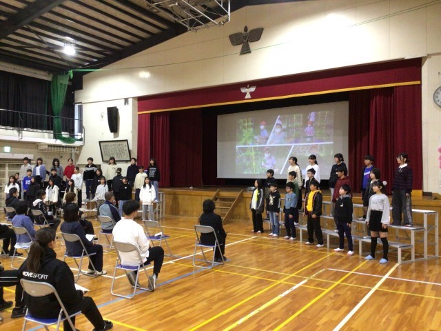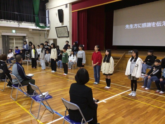 本日、6年生は「先生方に感謝する会」を行いました。6年生がこの一年間取り組んできた「褒め言葉のシャワー」になぞらえ、褒め言葉と感謝の気持ちがしたためられたお手紙と手作りの卓上カレンダーをこれまでいろいろな場面でお世話になった先生へプレゼントしました。次に代表児童が順に感謝の気持ちを述べ、最後に6年間の思い出をスライドで振り返りながら学年全体で群読と合唱により感謝の気持ちを伝えました。最後の合唱での大きな口を開けて一生懸命に歌う姿からは、6年生の真心が伝わってきました。感謝する方もされる側もあたたかい気持ちになれた素敵な会となりました。