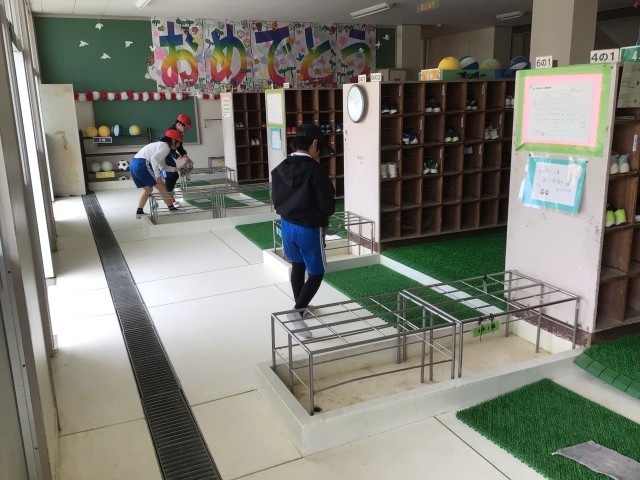 訓練後、運動場から戻ってきた児童が内履きの靴底を拭いて教室にあがれるよう、6年生の元環境委員の児童が、昇降口に雑巾を並べてくれました。