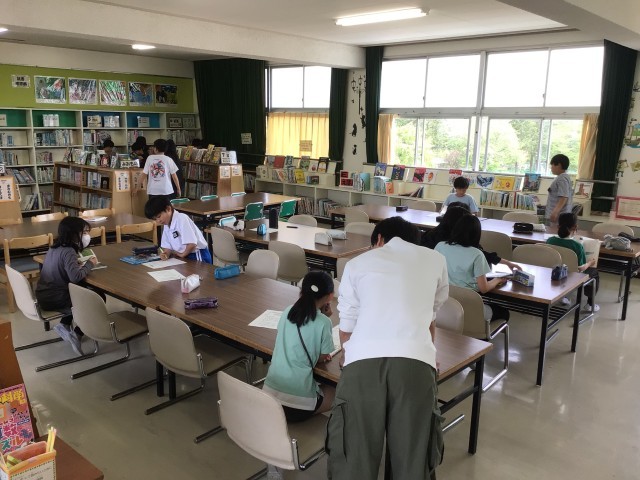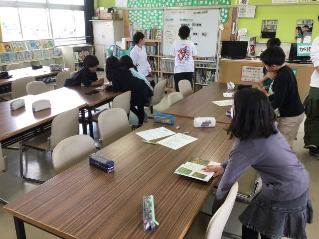 5年生では、調べ学習で図書室を有効に活用する方法について、ペンタゴンチャートやブックサーフィンによるテーマの見つけ方や内容に応じた資料の探し方等について学びました。その後、「愛知県の人口は?」や「大さじ一杯は何mL?」などのクイズについて、班で協力して解決するミッションに取り組みました。学んだことを生かしながら、クイズの答えが書いてありそうな本を熱心に探す児童の姿が見られました。