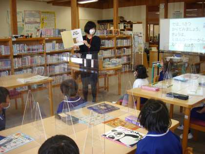 21日(水)に1・3・5年生で図書利用指導を行いました。図書館司書の原田さんが指導をしてくださいました。1年生は、図書館の本の借り方・返し方を教えていただきました。ひと通り教えていただいた後で、実際にみんな1冊ずつ本を借りてみました。初めての体験だったので、みんな緊張した表情で本を借りていました。