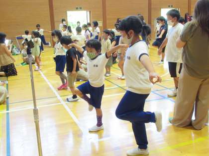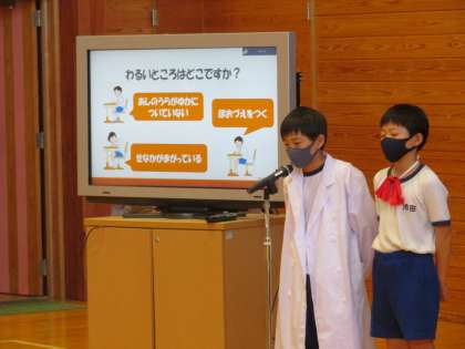 19日(月)に学校保健委員会を行いました。今年度は「姿勢」をテーマに稲武健康アカデミーの永井雄太先生を講師にお招きして行いました。はじめに元気もりもり委員会が、姿勢についての寸劇を披露し、姿勢を崩すと背骨がどんなふうに曲がっているかなどをとても分かりやすく教えてくれました。その後、永井先生から姿勢を整える体幹トレーニングを親子で学びました。頭と体を使ったとても有意義な時間となりました。
