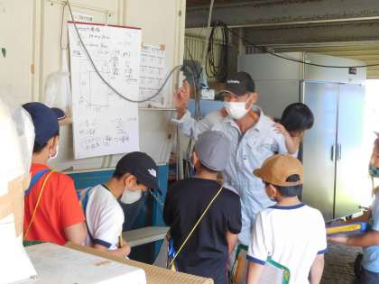 3年生は、校外学習で四ツ松の小林さんの家へ米づくりの様子を見学に行きました。小林さんから稲刈りや脱穀に使う機械の説明を受けたり、実際に手鎌で稲刈り体験もさせていただいたりしました。子どもたちは、小林さんからの説明に興味津々で、活発に質問もしていました。