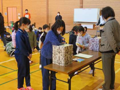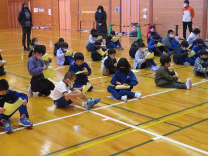 外は雪で銀世界となった7日の朝、体育館で冬休み明け集会を行いました。今年も校長先生が用意してくださったおみくじを全校児童が引きました。中身は今年の目標となるような励ましの言葉がそれぞれ書かれていました。今年も自分の目標を立て、それに向かって努力し、大きく成長してほしいと願っています。