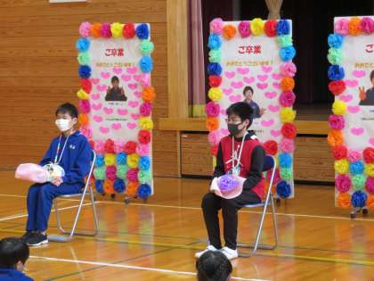 9日(水)に6年生を送る会を行いました。5年生が企画・準備から運営まで行ってくれました。5年生が作ったゲームを班ごとに楽しんだ後、思い出ムービーを観ました。1年生の時からの写真や今までお世話になった先生方からのメッセージも流れ、懐かしく観ました。その後、各学年から6年生へ感謝の贈り物をすると、6年生からも各学年へメッセージカードが贈られました。たがいに感謝の気持ちを伝え合う大変良い会となりました。