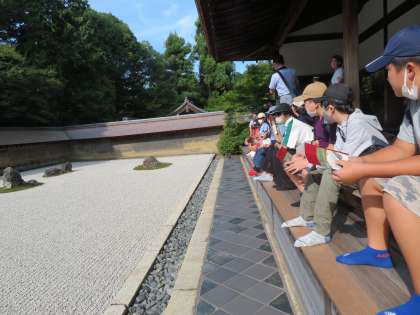 竜安寺に行き、石庭を見学しました。全部で15個あるはずの石がどこから見ても14個しか見えず、不思議な感じがしました。