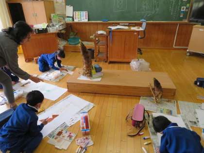 2年生の図画工作では、掘りたてのタケノコを囲んで絵を描きました。