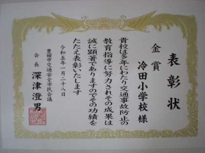 豊田市交通安全市民会議よりいただいた「金賞」の賞状を披露しました。これからも、交通安全に気を付けましょう。