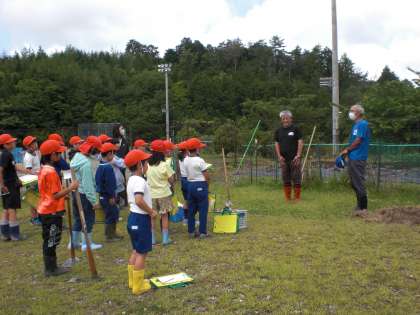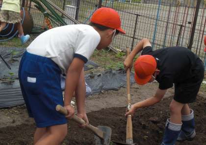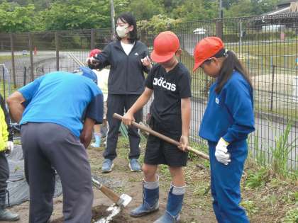 3・4年生が、地域の方に教えていただき、畑仕事を行いました。肥料を混ぜ、鍬を使って畝を作りました。次は、1週間後に種まきをします。