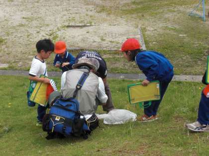 レンジャーの方に生き物の見分け方や指標生物、特定外来生物などについて教えていただき、運動場で生き物探しをしました。ショウリョウバッタとオンブバッタの区別をしたり、指標生物であるツマグロヒョウモンの幼虫を見つけたりなど、様々な生き物に触れ合うことができました。