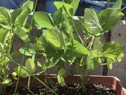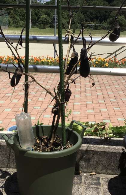 暑い日が続きます。バケツ稲もずいぶん成長し、カボチャやピーマン、枝豆、ミニトマトに実がなってきました。しかし、ナスの葉が今週なくなってしまいました。原因は、メンガタスズメ(蛾)の幼虫です。ナスの葉が大好物のようです。