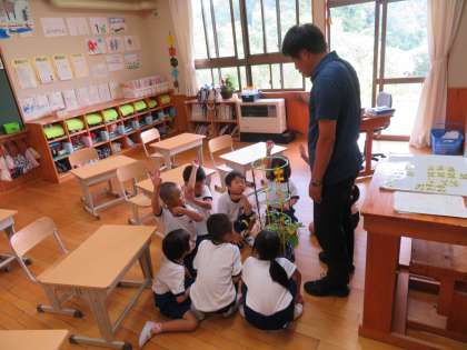 1年生は、育ててきた朝顔を囲んで茎や葉をじっくり観察しました。