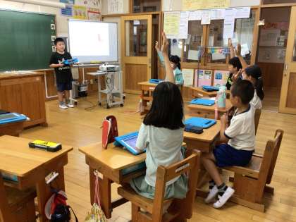 4年生は、タブレット端末でまとめた夏休みの思い出を大型テレビに映し、発表をしました。夏休みの出来事に対してたくさんの質問があがり、互いの思い出を共有しました。