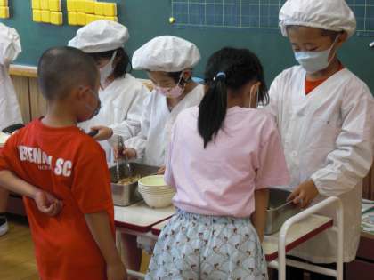 1年生も、給食の準備が上手になりました。こぼさないように気を付けてよそったり、そっとお皿を運んだりと、みんなで協力して配膳していました。