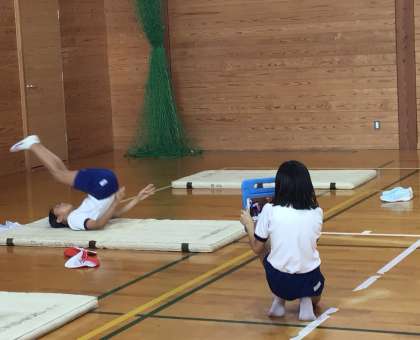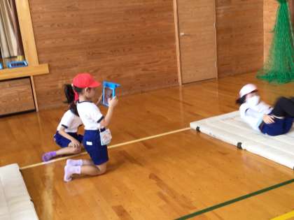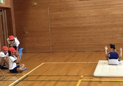 3・4年生の体育で、マット運動を行いました。学習用タブレットで友達に自分の動きを撮影してもらい、ポイントを確認しながら、何度も練習をしていました。
