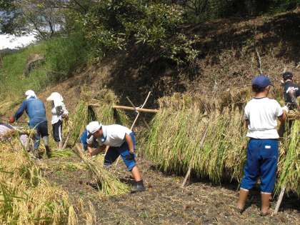 鎌で刈りスガイで縛り、はざかけにしました。蒸し暑い中、慣れない作業に「腰が痛い」「田植えのほうが簡単」と悪戦苦闘していました。落ち穂も協力して拾い、苦労して作ったお米を大事にしようとする思いが見えました。1週間の天日干しの後、次は脱穀です。