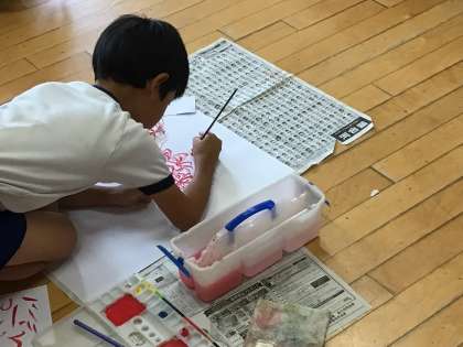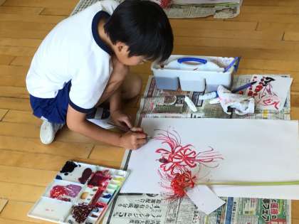 まず、花をよく見て、できるだけ近い色になるように、何度も絵の具を混ぜ合わせました。次に、花のつき方、茎の色の変化もよく見て描きました。どの子も、集中して画用紙いっぱいの彼岸花を咲かせました。