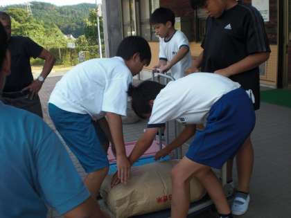 昨日、5年生が育ててきた米「ミネアサヒ」を脱穀をしました。今日は、地域の方が乾燥させ、学校まで持ってきてくださいました。収穫量は、104.4キログラム。過去最高の記録です。幻の米と言われる「ミネアサヒ」のおいしさが伝わるように、収穫した米の活用を話し合っていきます。