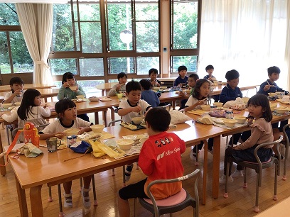 2・3年生と一緒の給食に、1年生もにこにこです。