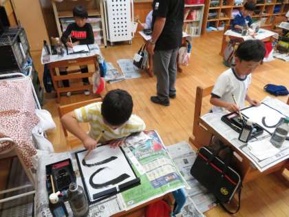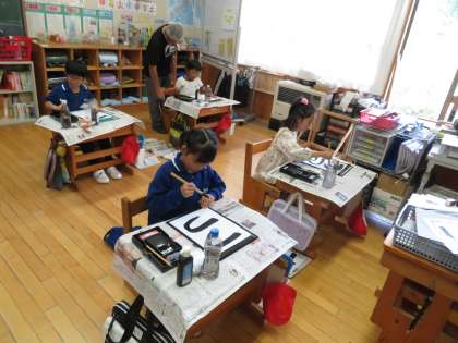 書道の時間では、姿勢や筆の持ち方に気を付けながら、ひらがなの「つ」を練習しました。力の強弱をつけた筆使いに苦戦しながら、集中して取り組んでいました。