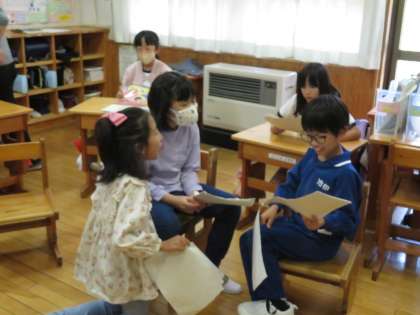 学芸・学習発表会に向けて、劇の台詞を互いに聞き合い、速さや聞きやすさを確認しています。みんなで力を合わせた素敵な発表を楽しみにしています。