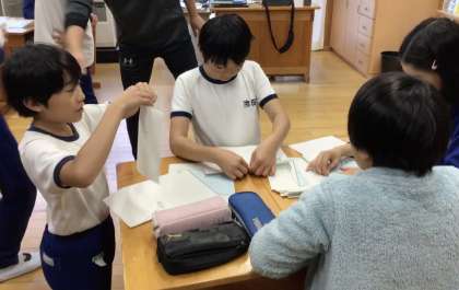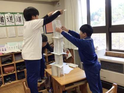5・6年生が学級活動で「ペーパータワー」に挑戦しました。グループに分かれ、道具を使わずにA4の用紙を高く積み上げ、その高さを競うゲームです。切って重ねたり、筒を作り柱に見立てたりと試行錯誤を繰り返す中で、話し合いを通して、よりよい解決方法を探ること、作業を分担し協力し合うことができていました。