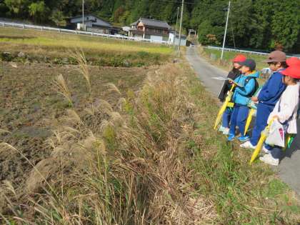 冷田のまち探検として、八王子神社⇨十明神社⇨四ツ松グランド をファミリー班(縦割り班)でまわりました。「杉の実を100gを集める」という課題にみんなで協力して取り組んだり、3・4年生の草花知識を聞いたりしました。ボランティアの保護者の協力もあり、秋を感じる楽しいウォークラリーとなりました。