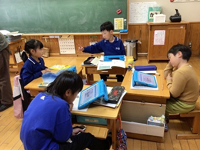 3年生が、グループ学習で算数の文章問題を解きました。まず、一人で考え解き方を図などを使いノートにかきます。次に、それを学習用タブレットで写真に撮り、グループでお互いの考え方を見合います。友達の考え方と比べ、話し合いながらよりよい解き方を探っていました。