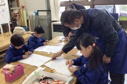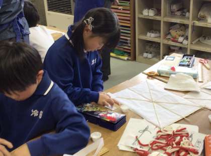 豊田市ものづくり教育プログラムの一環として、和凧づくりに挑戦しました。ものづくりサポーターの方のご指導のもと、ひごを張り、糸やしっぽをつけました。明日の凧揚げが、楽しみです。