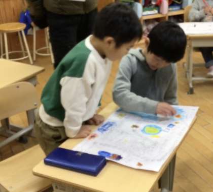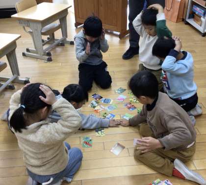 1年生が冬の遊びに取り組みました。はじめは、愛知県カルタです。1枚でも多く取ろうと、どの子も真剣に読み手の言葉を聞きました。次は、手作りのすごろくです。算数の学習「大きいかず」で学んだ100までのすごろくを作り、友達と対戦を楽しみました。