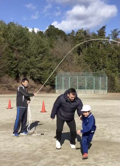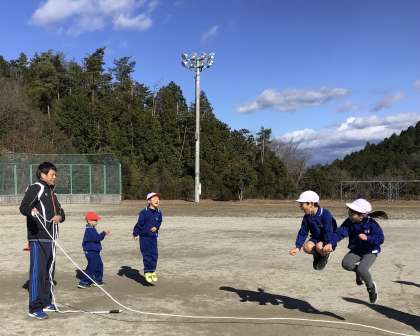 1・2年生が体育の学習で大縄跳びを行いました。1年生も2年生に教えてもらい、少しずつタイミングよく跳べるようになってきました。最後は、2人で同時跳びに挑戦。声を掛け合い、息を合わせて跳んでいました。