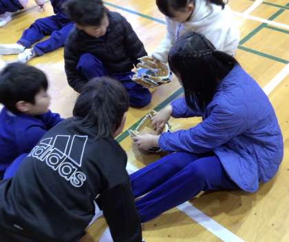 大谷翔平選手から寄付されたグローブが届き、朝会で披露しました。全校の子が見つめる中、開封するとピカピカのグローブが3つ。今日は、順に全員が手にはめてみました。「人生が夢をつくるんじゃない。夢が人生をつくるんだ」という大谷選手の言葉通り、夢をもって、努力を続けてほしいと願っています。
