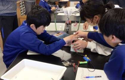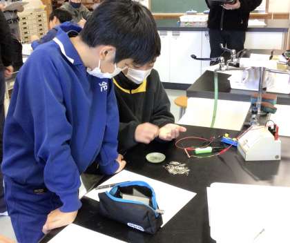 5年生が理科で「電磁石の性質」について学習しています。今日は、導線の太さと電磁石の強さの関係を調べました。グループで協力して回路を作り、クリップがつく数を比べました。