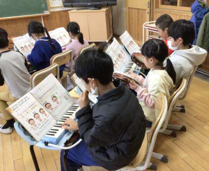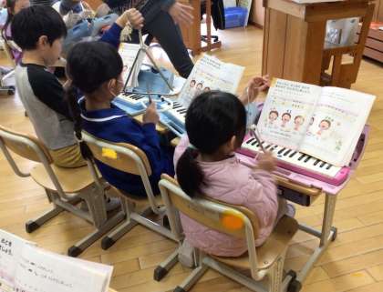 1・2年生が音楽の学習で、「とんくるりん ぱんくるりん」の合奏をしました。鍵盤ハーモニカで上手に演奏できるようになったので、今日はリズム打ちと合わせました。使う楽器は、タンバリンとトライアングルです。リズムにのって、みんなで合わせる楽しさを味わいました。