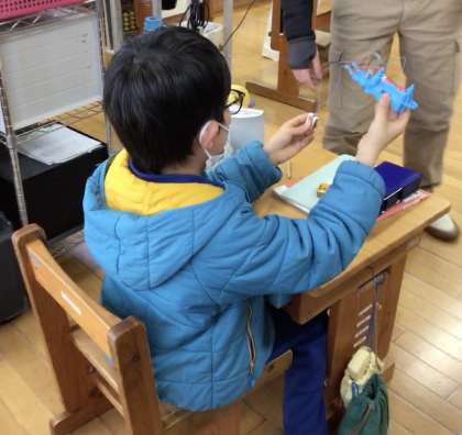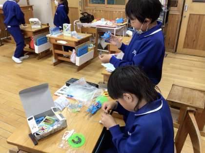 3年生が理科で学習したことを生かして、おもちゃを作りました。電池と豆電球をつないだ回路に磁石を組み合わせ、クリップがついた魚を釣ると豆電球が光るおもちゃを完成させました。電池や磁石の仕組みのまとめが、楽しくできました。