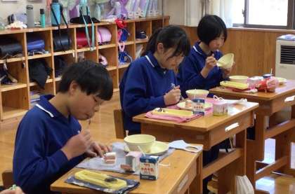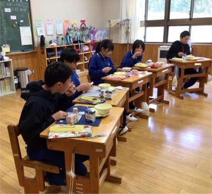 今日の給食は、卒業祝い献立で、赤飯・えびカツ・和風サラダ・すまし汁・デザートはいちごケーキでした。ケーキの甘いクリームに大喜び。みんなで「おいしいね」と言いながら、頬張りました。6年生5人で食べる給食も、後1回。最後まで、おいしく楽しく食べてほしいです。